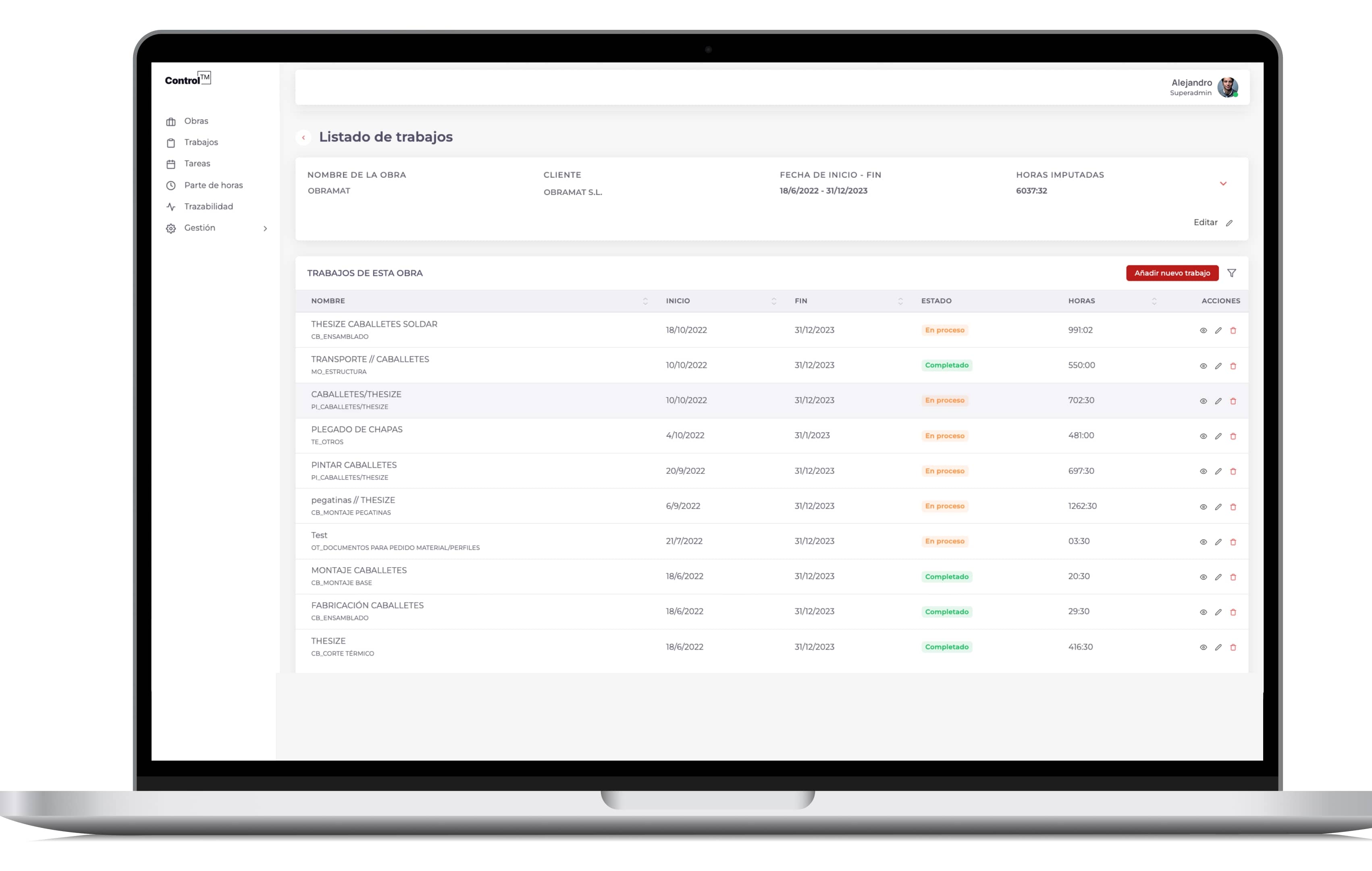 Controla las horas imputadas por cada miembro del equipo en cada tarea u obra, con trazabilidad completa para análisis de productividad.